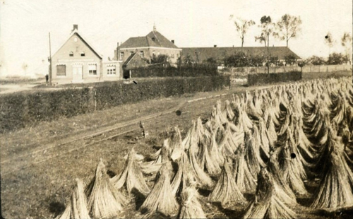 Op de voorgrond de vlaskapellen van de vlassersfamilie Seynaeve met daarachter het tramspoor. Op de achtergrond de herberg De Tivoli en rechts daarvan het klooster en de meisjesschool.